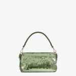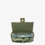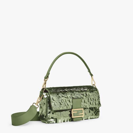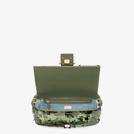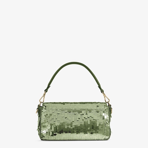 Hand-embroidered with green sequins of different shapes and sizes. Embellished with tone on tone calfskin details and decorated with an FF clasp.