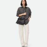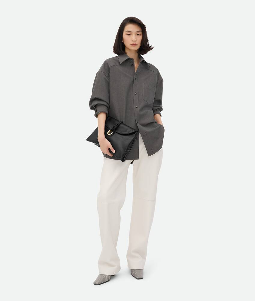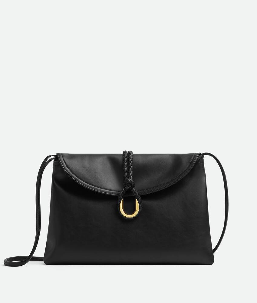 Cross-body bag in smooth calf leather with double flap. Fastened with a sculptural