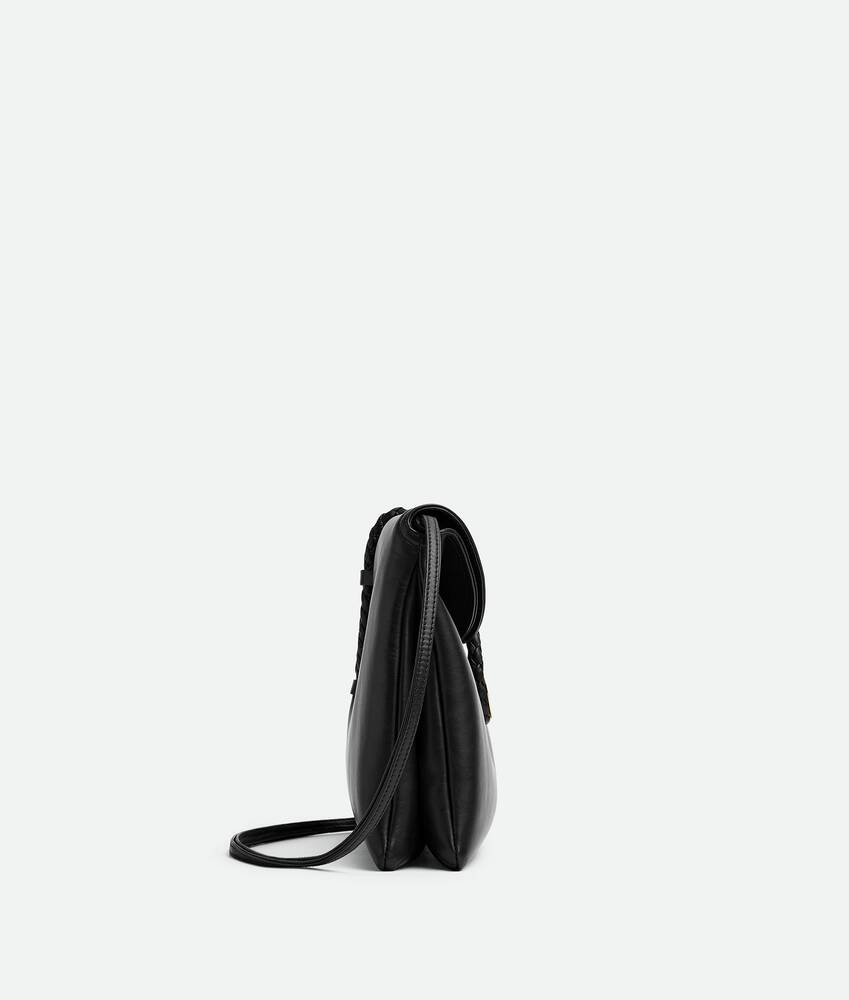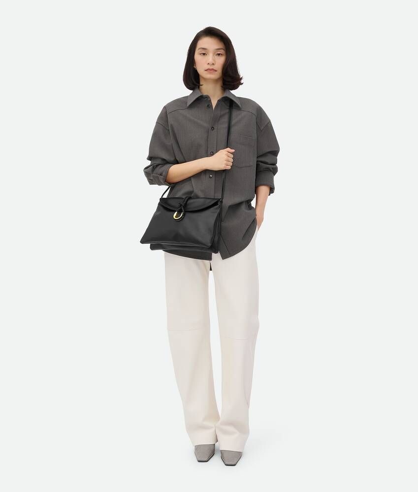 • Cross-body bag in smooth calfskin leather with double flap and fastening system consisting of metal elements and coaxial cord