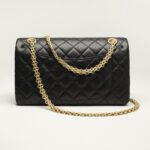 The Reissue 2.55 Single Flap Bag is crafted from distressed black calfskin with antique gold hardware, front flap with Mademoiselle turnlock closure, half-moon back pockets and interwoven gold chain links.
