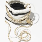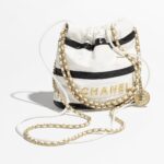 This mini 22 Hobo bag is crafted from black and white calfskin with gold-tone hardware and features signature diamond quilting, gold-tone metal CHANEL lettering on the front, and a long chain interwoven with gold and white leather.