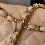 This medium classic double flap bag is crafted in light beige caviar leather with light gold hardware, featuring the signature CC turnlock closure on the front flap, half-moon back pocket, adjustable interwoven light gold chain and light beige leather shoulder strap.