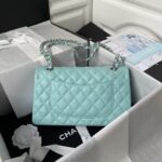 This medium classic double flap bag is crafted in light blue caviar leather with silver hardware, featuring the signature CC turnlock closure on the front flap, half-moon back pocket, adjustable interwoven light silver chain and light blue leather shoulder strap.