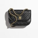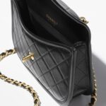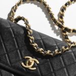 This flap bag is crafted from black quilted caviar leather with antique gold hardware and features a CC logo front flap, antique gold chain links and a black leather padded shoulder/crossbody strap.