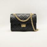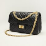 This Mini Reissue 2.55 Single Flap Bag is crafted from black distressed calfskin with antique gold hardware, front flap with Mademoiselle turnlock closure, half-moon back pockets and interwoven gold chain links.