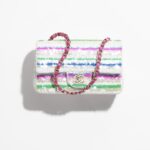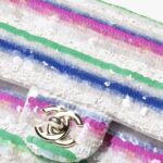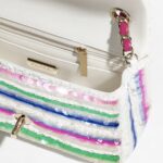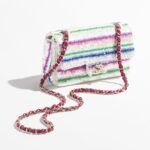 This Chanel Mini Rectangular Flap Bag in colorful sequins and white tweed features light gold hardware, a front flap with CC turnlock closure, half-moon back pockets and interwoven light gold links, and a pink shoulder/crossbody strap.