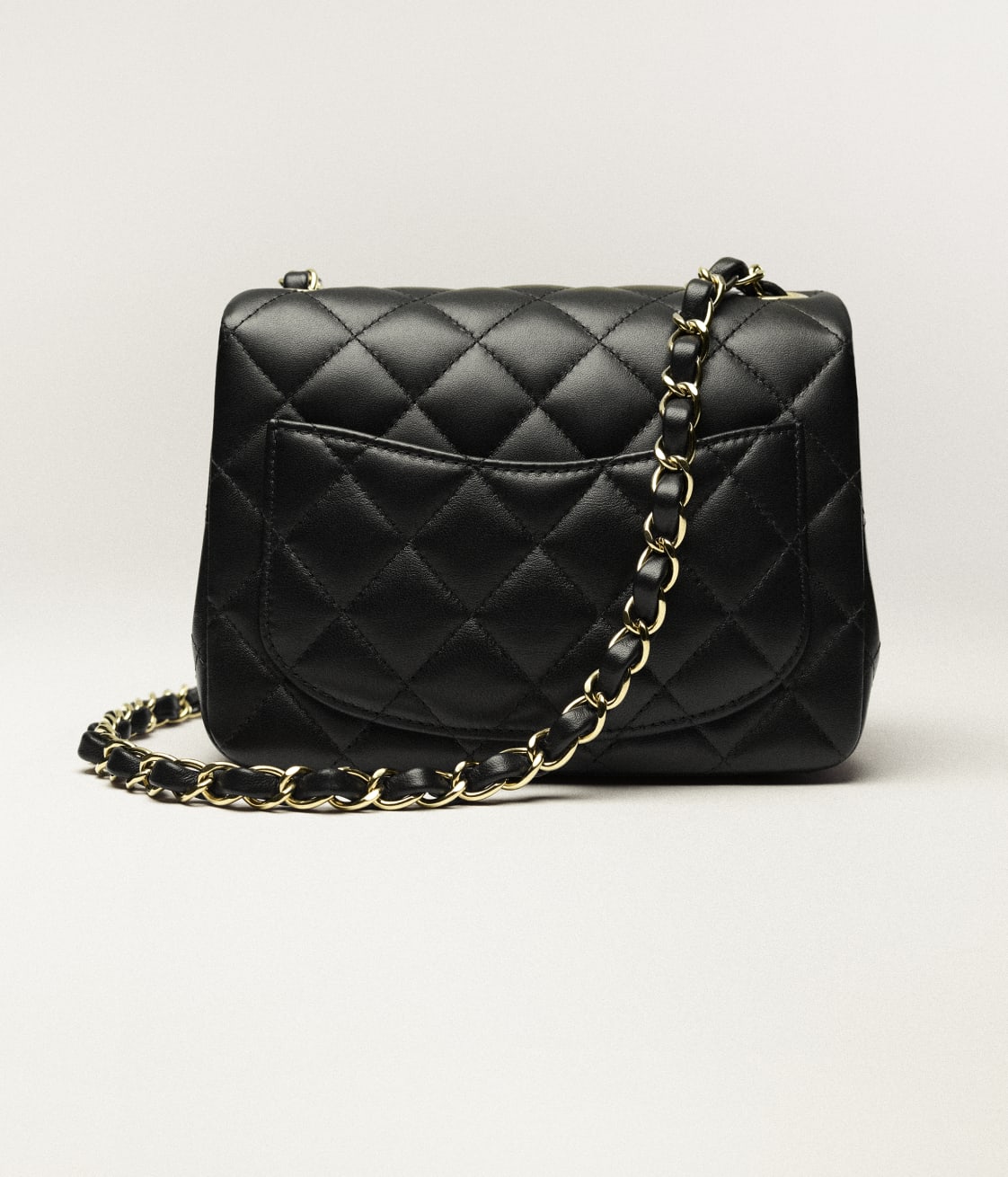 This Chanel Classic Mini Square flap bag is in black lambskin leather with light gold tone hardware and has a front flap with signature CC turnlock closure, tonal stitching, rear half moon pocket and single interwoven black leather and light gold tone chain link shoulder/crossbody strap.