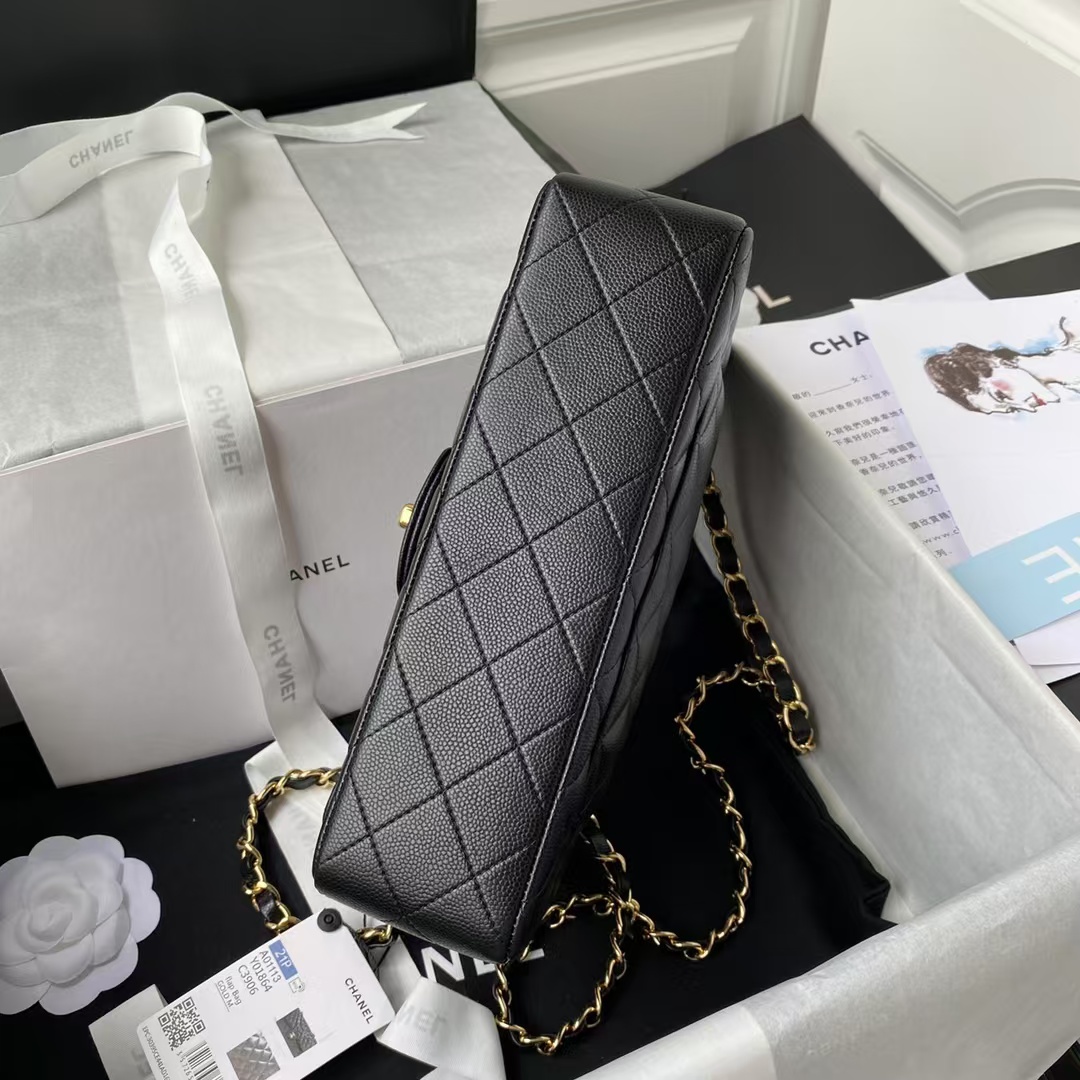 This small Classic Double Flap Bag in black caviar leather with gold hardware features a front flap with signature CC turnlock closure, half-moon back pocket, adjustable gold interwoven chain links and a black leather shoulder strap.