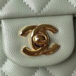 This small Classic Double Flap Bag in Light Green Caviar Leather with Light Gold Hardware features the signature CC turnlock closure on the front flap, half-moon back pocket, adjustable interwoven Light Gold Chain and Light Green Leather Shoulder Strap.