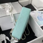 This small Classic Double Flap Bag is crafted in light blue caviar leather and features light gold hardware, front flap with signature CC turnlock closure, half-moon back pocket, adjustable interwoven light gold chain and light blue leather shoulder strap.