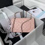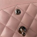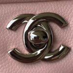 This small Classic Flap Bag in light pink caviar leather with silver hardware features a front flap with CC turnlock closure, half-moon back pocket, adjustable silver interwoven chain links and light pink leather shoulder/crossbody strap.