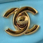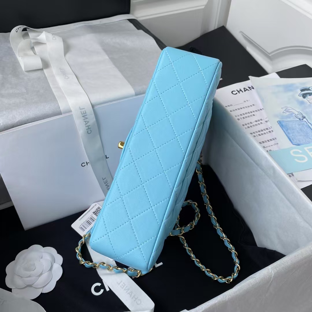 This small classic double flap bag is crafted in blue lambskin with light gold hardware, front flap with signature CC turnlock closure, half-moon back pocket, adjustable interwoven light gold chain and blue leather shoulder strap.
