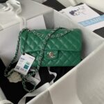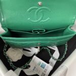 This small classic double flap bag is crafted in green lambskin with silver hardware, front flap with signature CC turnlock closure, half-moon back pocket, adjustable interwoven silver chain and green leather shoulder strap.