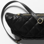 This black shiny calfskin belt bag with light gold hardware features tonal stitching and light gold hardware on the front, two small front pockets with magnetic closures, gold metal CC logo, zip pocket on the belt bag, light gold and metal interweaving, black leather chain link belt/crossbody strap.