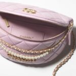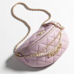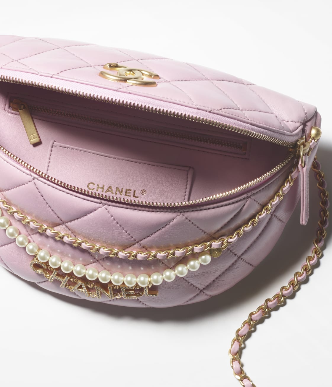 This small waist bag features pink lambskin, faux pearls and light gold hardware, tonal stitching, faux pearls and light gold hardware CC on the front of the bag, zipper closure, zipper pocket on the waist bag, light gold tones interwoven with metallics, pink leather chain link waist/crossbody strap.