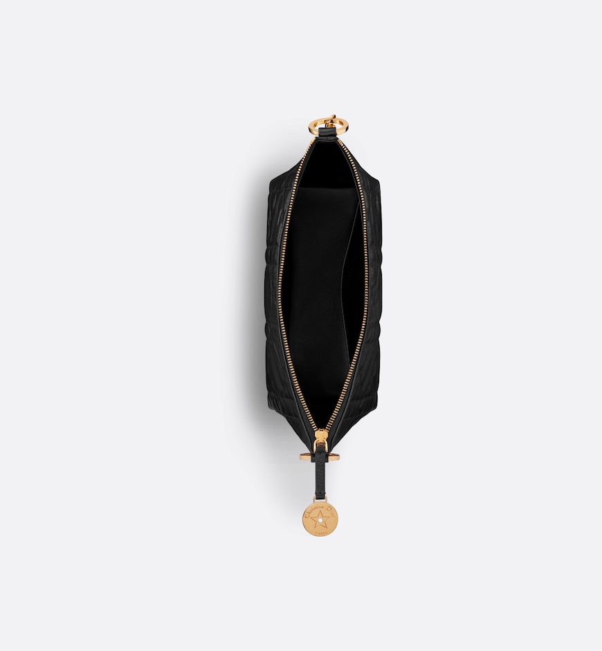 The Diorstar hobo bag with chain has a practical, modern look. Crafted in black lambskin with Macrocannage stitching, it features a supple silhouette and spacious compartment. Its design is enhanced by a zip closure embellished with a medallion engraved with the Christian Dior Paris signature and a star, the House’s flagship symbol, while discreet CD studs adorn the sides. The interior has card slots, while the leather insert on the adjustable CD chain link strap allows the bag to be worn comfortably over the shoulder.