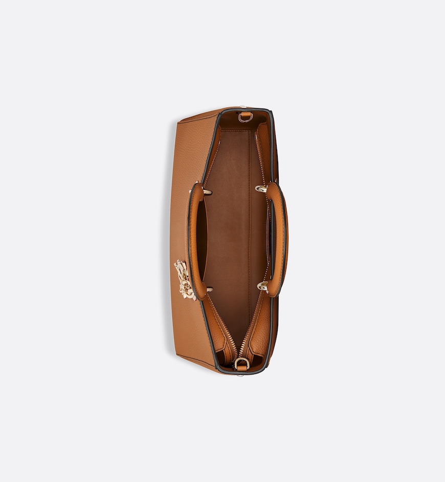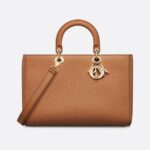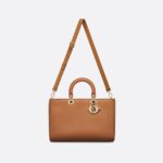 New for Summer 2024, the Lady D-Sire bag draws inspiration from the signature elegance of the Lady Dior design. Reimagined with a casual style for an urban look, the lightweight dark brandy grained Taurillon leather feels soft to the touch yet offers excellent durability. The large style is embellished with pale gold-finish metal D.I.O.R. charms highlighting the silhouette. Showcasing a removable, thin leather shoulder strap, the unique bag can be carried by hand or over the shoulder.
