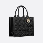 Maria Grazia Chiuri’s hallmark Dior Book Tote offers an original take on elegance. Crafted in black calfskin, the design showcases the Macrocannage motif and is embellished with pale gold-finish metal D.I.O.R charms on one of the handles. The cashmere leather interior reveals a zip pocket and patch pockets, ideal for organizing all the daily essentials. Featuring an adjustable and removable strap, the lightweight and practical medium tote is a prime example of Dior savoir-faire and may be carried by hand or worn over the shoulder.
