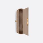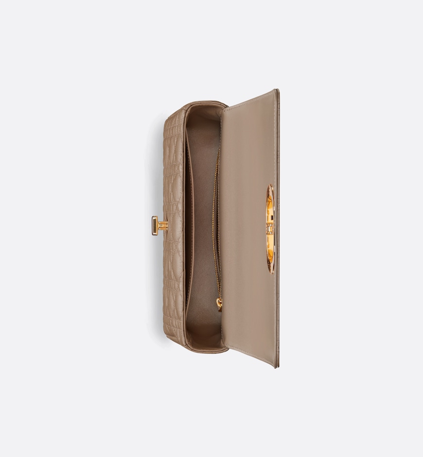 The Dior Caro bag combines modernity with timeless elegance. The style is crafted in warm taupe supple calfskin with Cannage stitching. The bag showcases a flap adorned with an antique gold-finish metal CD twist clasp, inspired by the seal of a Christian Dior perfume bottle. The detachable chain shoulder strap with CD signature links allows the medium bag to be carried by hand, worn over the shoulder or crossbody, and may be replaced by one of the House’s wide embroidered straps for day or evening attire.