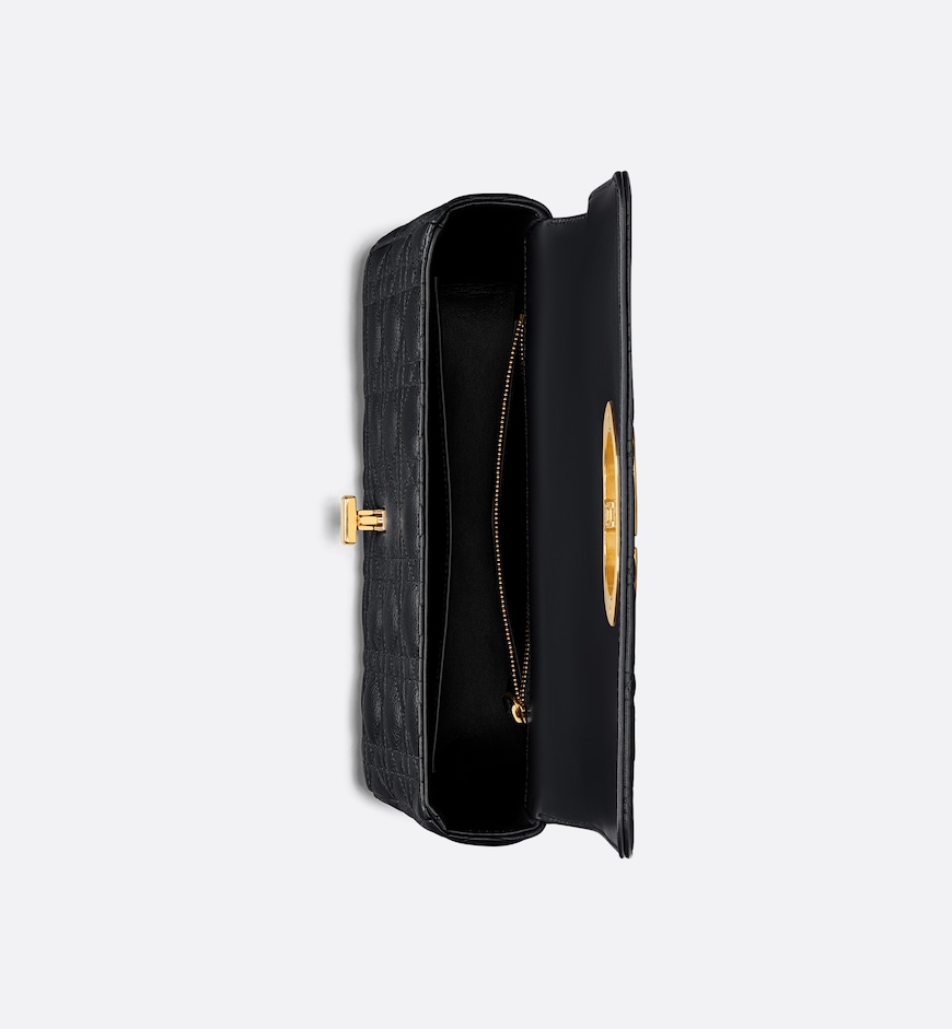 The Dior Caro bag combines modernity with timeless elegance. The style is crafted in black supple calfskin with Cannage stitching. The bag showcases a flap adorned with an antique gold-finish metal CD twist clasp, inspired by the seal of a Christian Dior perfume bottle. The detachable chain shoulder strap with CD signature links allows the medium bag to be carried by hand, worn over the shoulder or crossbody, and may be replaced by one of the House’s wide embroidered straps for day or evening attire.