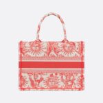 Introduced by Maria Grazia Chiuri, Creative Director of Christian Dior, the Dior Book Tote has become a staple of the Dior aesthetic and is part of the Dioriviera capsule. Designed to hold all the daily essentials, the style is fully embroidered with the Toile de Jouy Soleil motif in coral, offering a new take on the House icon layering suns and crescent moons into a floral pattern representing the four seasons. Exemplifying House savoir-faire, the medium tote is adorned with the Christian Dior Paris signature on the front. It can be carried by hand or worn over the shoulder.