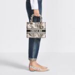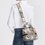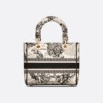 The Lady D-Lite bag combines classic elegance with House modernity. The style is fully embroidered with the latte and black Toile de Jouy Zodiac motif, a new take on the iconic pattern inspired by Mr. Dior’s passion for astrology. A Christian Dior Paris signature adorns the front, while thick D.I.O.R. charms in pale gold-finish metal further enhance and highlight the silhouette. Featuring a wide, reversible and removable embroidered shoulder strap, the medium Lady D-Lite bag can be carried by hand or worn crossbody.