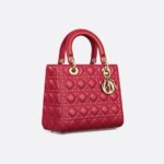 - The Lady Dior bag epitomizes the House’s vision of elegance and beauty. Sleek and refined, the timeless yet relevant style is crafted in cherry red lambskin with Cannage stitching, creating the instantly recognizable quilted texture. The pale gold-finish metal signature D.I.O.R. charms offer elegant appeal. Featuring a thin, removable leather shoulder strap, the medium Lady Dior bag can be carried by hand, worn over the