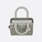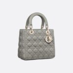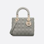 - The Lady Dior bag epitomizes the House’s vision of elegance and beauty. Sleek and refined, the timeless style is crafted in stone gray lambskin with Cannage stitching, creating the instantly recognizable quilted texture. The pale gold-finish metal D.I.O.R. charms offer elegant appeal. Featuring a thin, removable leather shoulder strap, the medium Lady Dior bag can be carried by hand or worn crossbody.
