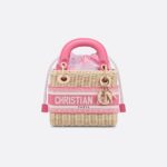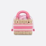 Part of the Dioriviera capsule, the Lady Dior bag epitomizes Dior’s vision of elegance and beauty. Sleek and refined, the timeless style exemplifies House savoir-faire with handwoven natural wicker. It features leather top handles and an interior drawstring pouch in candy pink Toile de Jouy jacquard. The embroidered Christian Dior Paris band, inspired by the Dior Book Tote, and pale gold-finish metal D.I.O.R. charms illuminate the silhouette. A wide, removable embroidered strap allows the miniature bag to be carried by hand, worn over the shoulder or crossbody.z`