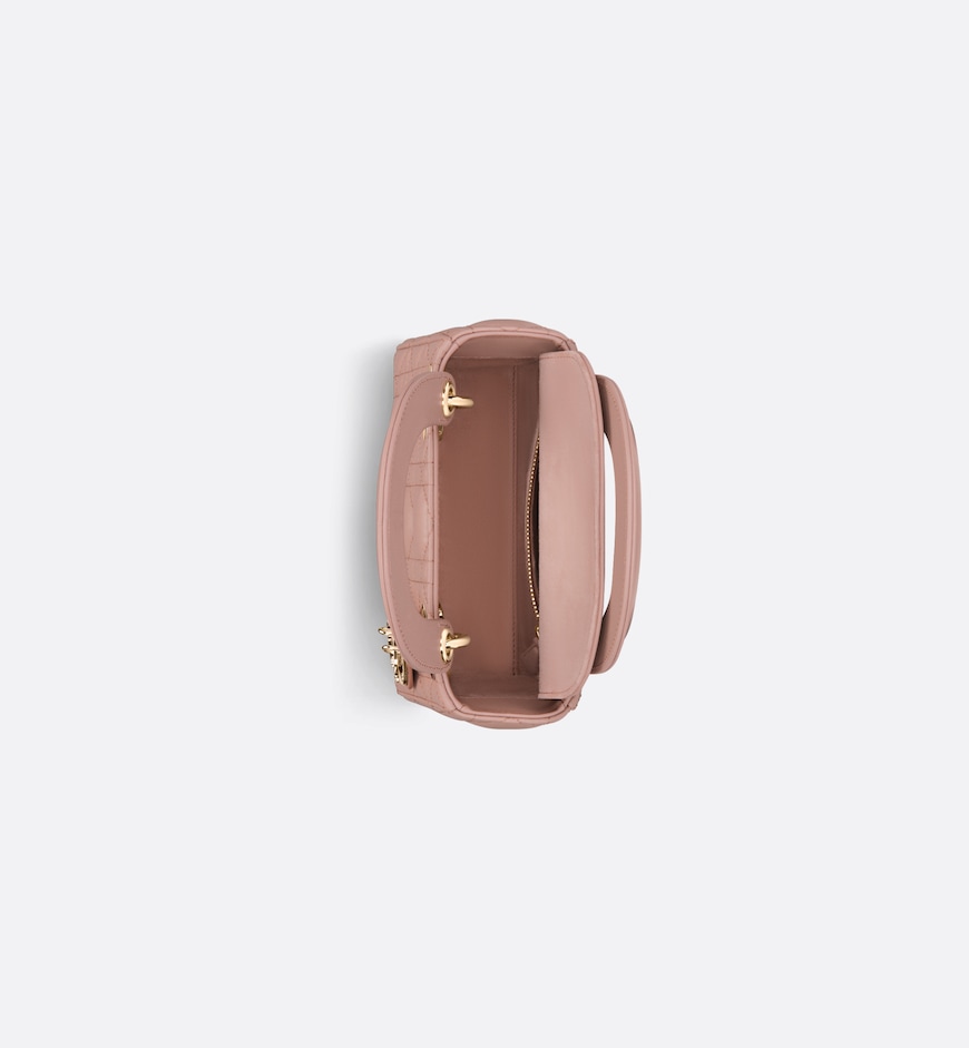 - The Lady Dior bag epitomizes the House’s vision of elegance and beauty. Refined and sleek, the timeless creation is crafted in blush lambskin and covered with Cannage stitching, creating an instantly recognizable quilted texture. The pale gold-finish metal D.I.O.R. charms embellish and illuminate its silhouette. Featuring a removable chain shoulder strap, the miniature Lady Dior bag can be carried by hand or worn