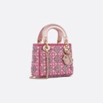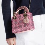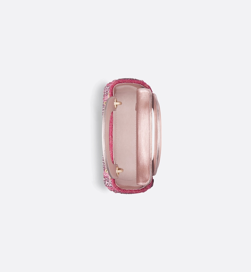 • The Lady Dior bag epitomizes Dior’s vision of elegance and beauty. It demonstrates the House’s unique leather craftsmanship and is offered in Rose des Vents satin, embroidered with a multitude of resin pearls in a hallmark Cannage-motif design, while the handles are crafted in tonal metallic calfskin. The pale gold-finish metal D.I.O.R. charms are adorned with white crystals and further embellish its silhouette. The miniature style, with its removable chain shoulder strap, can be carried by hand or worn crossbody and will be the ideal evening wear companion.