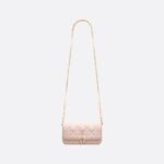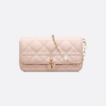The My Dior – Dior Talk Phone Pouch is a clever and sophisticated creation. Crafted in powder pink Cannage lambskin, it features pale gold-finish metal D.I.O.R. charms. Completed by an elegant removable chain punctuated with resin pearls, the phone pouch can be carried by hand, worn over the shoulder or crossbody.