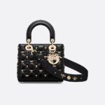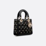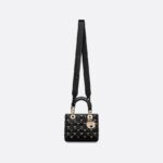 • The Lady Dior My ABCDior bag epitomizes Dior’s vision of elegance and beauty. Sleek and refined, the timeless style is crafted in black Cannage lambskin accented by gold-finish dragonfly studs referencing the collection’s signature theme. Pale gold-finish metal D.I.O.R. charms and a dragonfly charm further embellish and illuminate its silhouette. The small, unique design may be personalized with badges placed on its shoulder strap and can be carried by hand or worn crossbody.