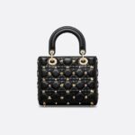 • The Lady Dior My ABCDior bag epitomizes Dior’s vision of elegance and beauty. Sleek and refined, the creation is timeless. Constructed in black Cannage lambskin, the bag is accented by gold-tone resin pearls and gold-finish zodiac sign studs. Pale gold-finish metal D.I.O.R. charms embellish and illuminate the silhouette. The unique, small design may be personalized with badges placed on its shoulder strap and can be carried by hand or worn crossbody.