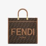 Medium Sunshine Shopper bag made of fabric with brown FF jacquard motif and “FENDI ROMA” lettering in light brown leather and stiff leather handles.