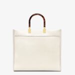 Medium Sunshine Shopper bag made of white leather with hot-stamped “FENDI ROMA” and stiff tortoiseshell plexiglass handles.