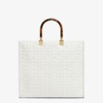 Medium Sunshine Shopper bag made of white leather with raised 3D-texture FF motif and rigid tortoiseshell-effect plexiglass handles.