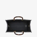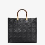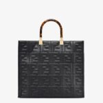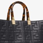 Medium Sunshine Shopper bag made of black leather with raised 3D-texture FF motif and rigid tortoiseshell-effect plexiglass handles.