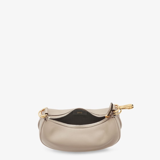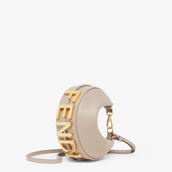 Mini hobo bag made of soft dove grey leather, embellished with vintage gold metal FENDI lettering.