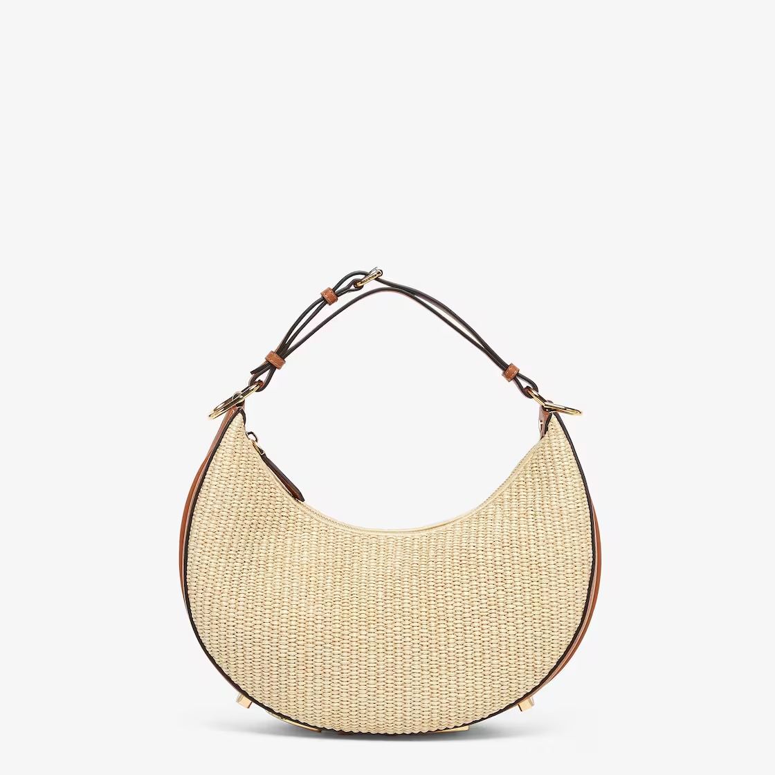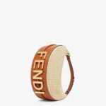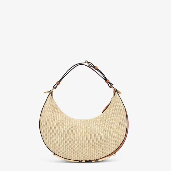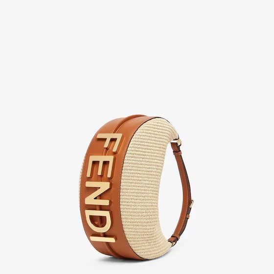 Small hobo bag made of natural-colored straw in a moss-stitch textured weave, with background and details in brown leather. With vintage gold metal FENDI lettering visible when the bag is worn under the arm.