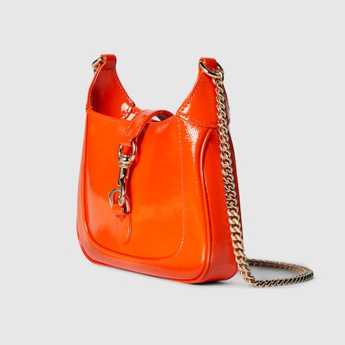 The Jackie Notte is a new handbag designed for Gucci by Creative Director Sabato De Sarno. It embodies the self-confidence of the iconic Jackie line, with a new silhouette and subtle details that make it perfect for nighttime wear. Orange patent leather, a hook closure, and light gold-toned Gucci lettering chain strap give this mini shoulder bag a unique touch.