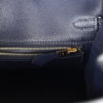 The interior is lined with Bleu Indigo chevre and has one zip pocket with an Hermès engraved zipper pull and an open pocket on the opposite side.