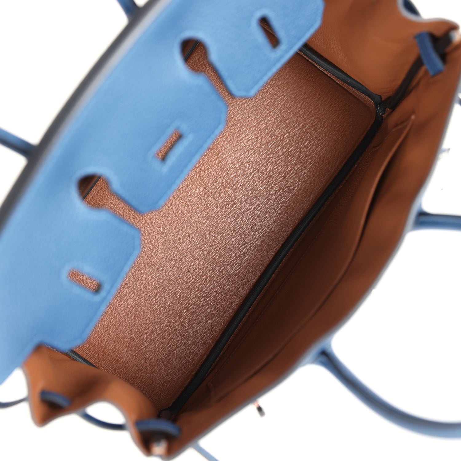The interior is lined with Muscade chevre and has one zip pocket with an Hermès engraved zipper pull and an open pocket on the opposite side.