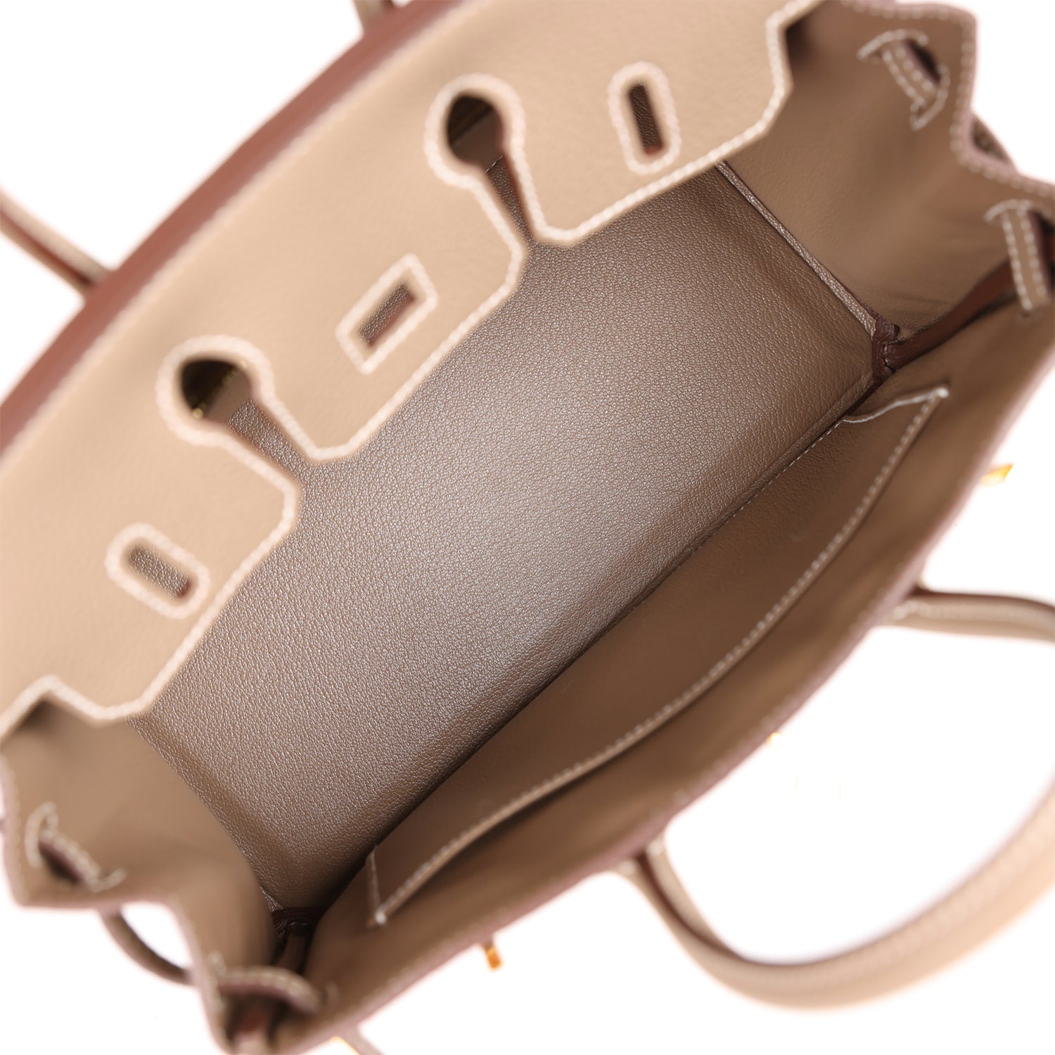 The interior is lined with Etoupe chevre and has one zip pocket with an Hermès engraved zipper pull and an open pocket on the opposite side.