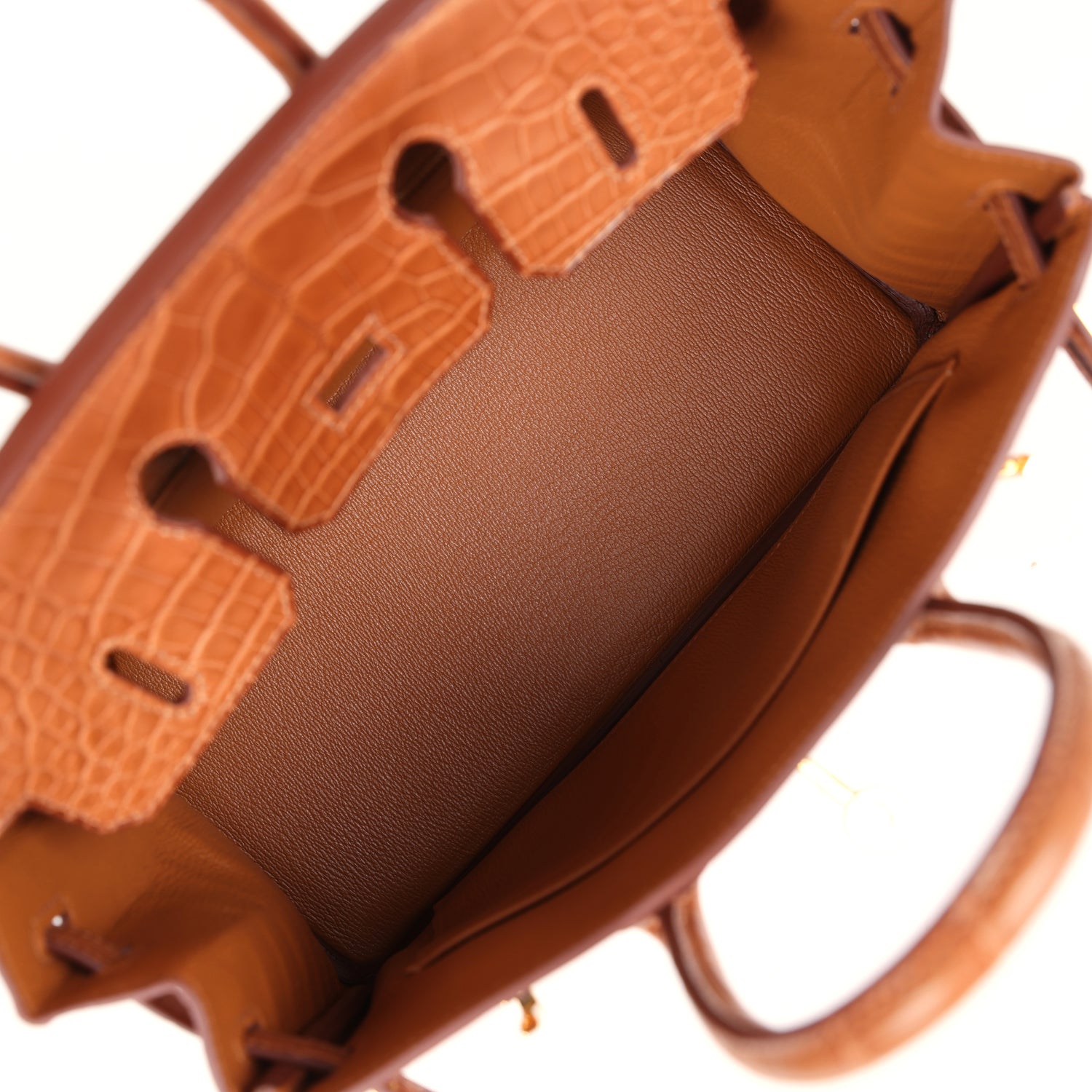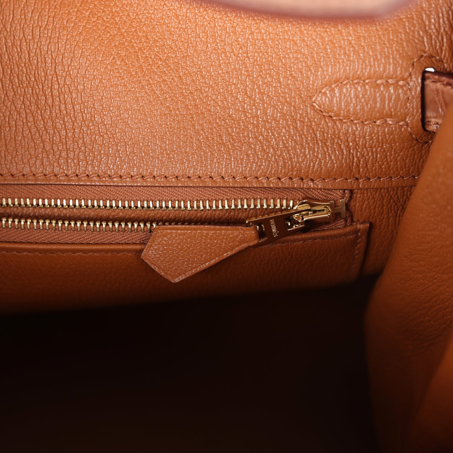 The interior is lined with Gold chevre and has one zip pocket with an Hermès engraved zipper pull and an open pocket on the opposite side.