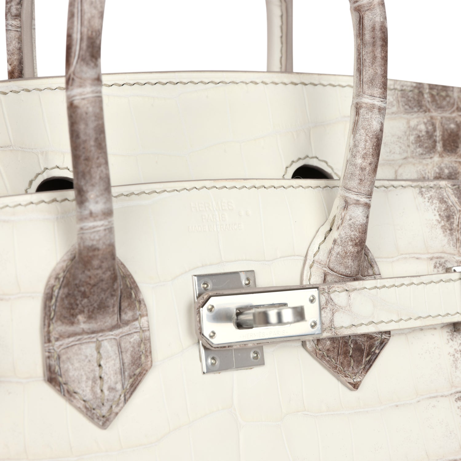 This Himalaya Birkin is in Niloticus crocodile leather with palladium hardware and has contrast stitching, front flap, two straps with center toggle closure, clochette with lock and two keys, and double rolled handles.