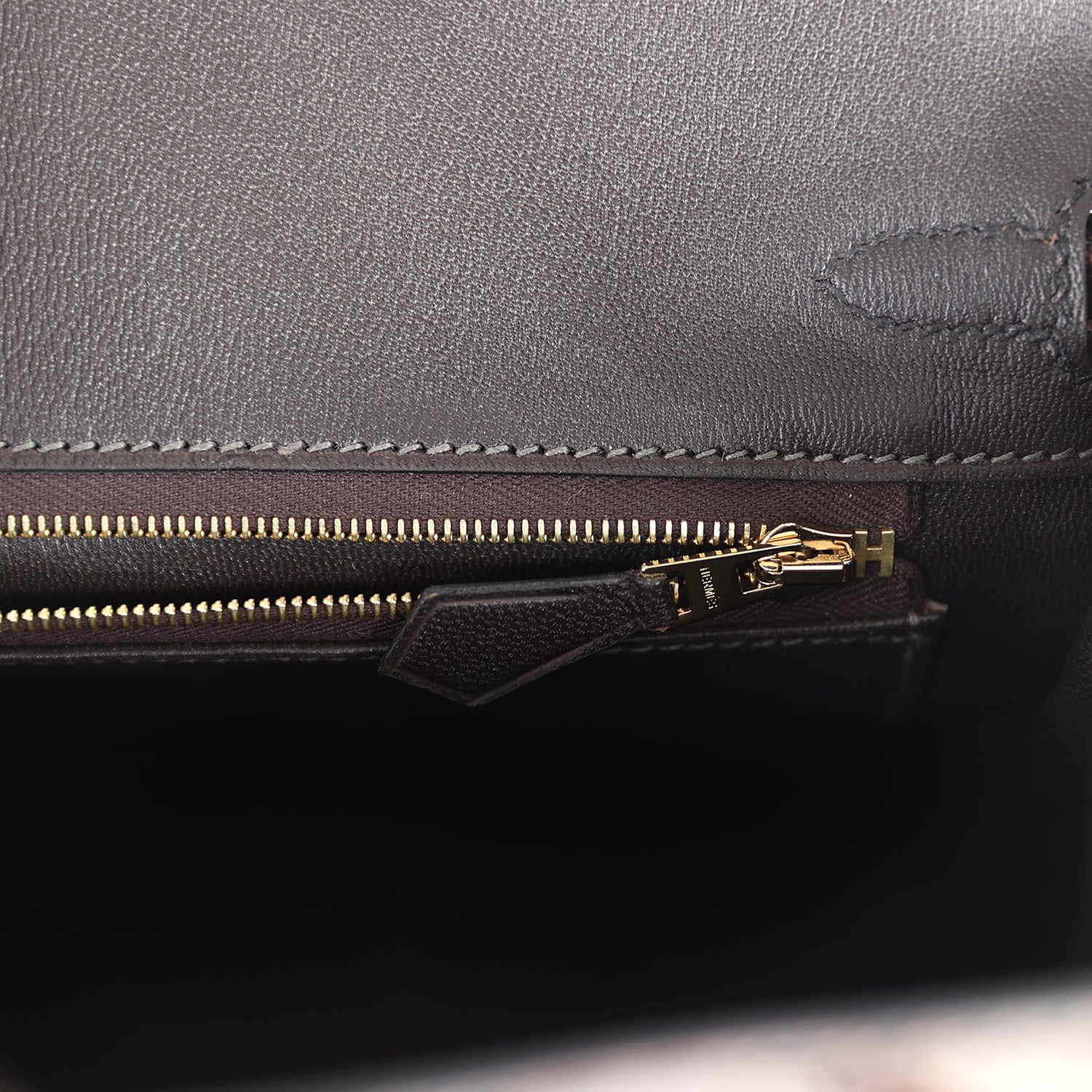 The interior is lined with Macassar chevre and has one zip pocket with an Hermès engraved zipper pull and an open pocket on the opposite side.