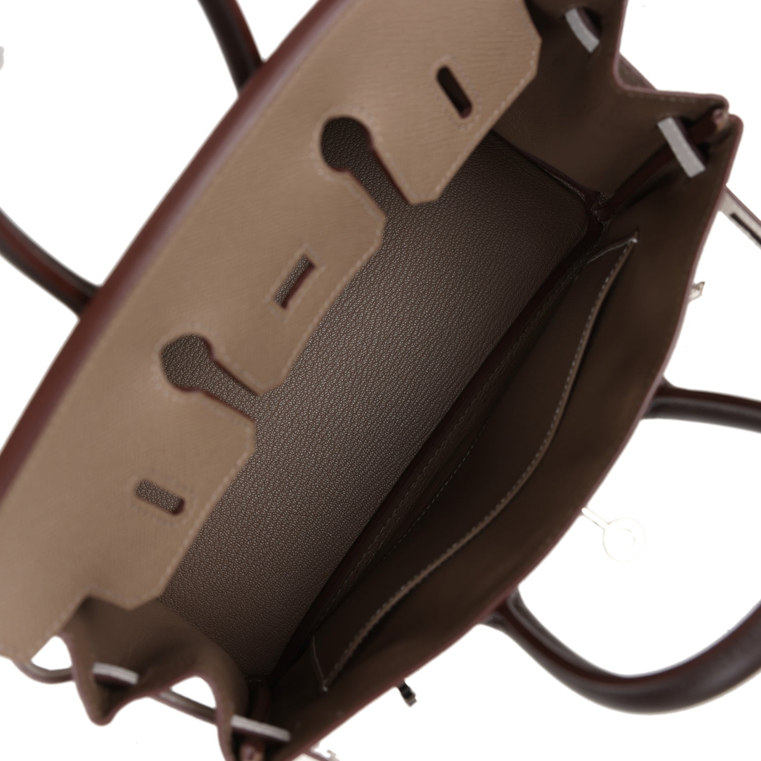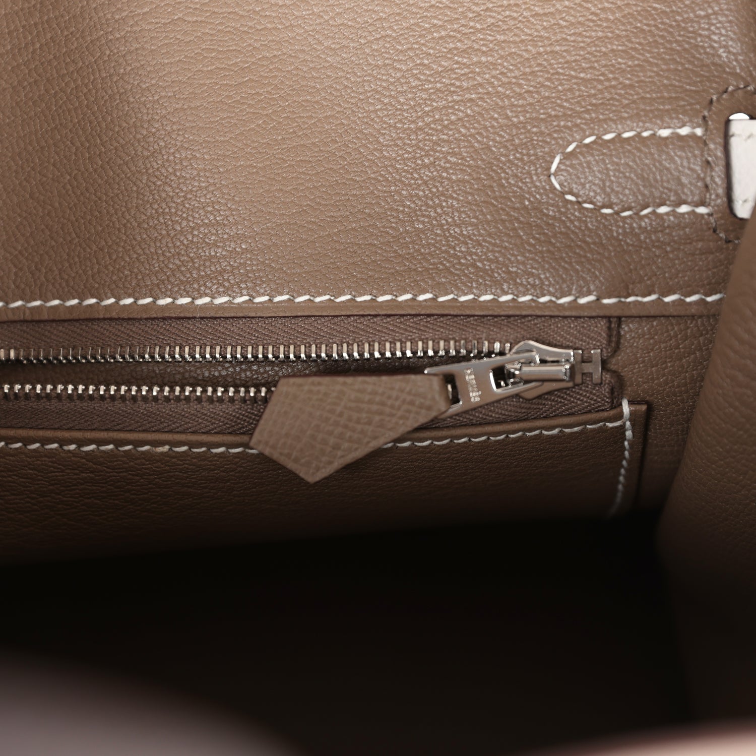 The interior is lined with Etoupe chevre and has one zip pocket with an Hermès engraved zipper pull and an open pocket on the opposite side.