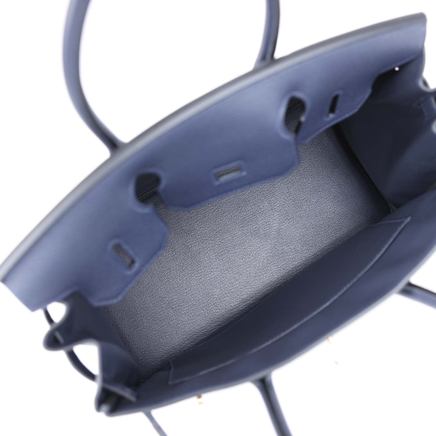 The interior is lined with Bleu Nuit chevre and has one zip pocket with an Hermès engraved zipper pull and an open pocket on the opposite side.
