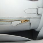 The interior is lined with Bleu Pale chevre and has one zip pocket with an Hermès engraved zipper pull and an open pocket on the opposite side.